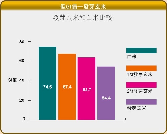 發芽玄米是在以GI作為指標的血糖值控制標準下,與糙米同樣位為低。