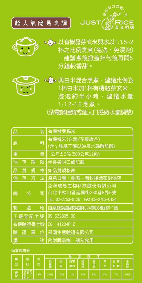 加入上次未結帳之商品 × 以台東產有機梗玄米品種,獲得有機認證的天然無農藥栽培環境,以好山、好水、好環境的理念,